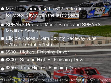 Pinnacle Peak Steakhouse Fast Time Bonus We are proud to announce that Pinnacle Peak Steakhouse - San Dimas, have sponsored the fast time awards for the 2024 All-Star Showdown at Irwindale Speedway. SPEARS Southwest Tour Series - $1,000 SPEARS Pro Late Model Series - $500 SPEARS Modified Series - $500 Thank you, Glenn [...]