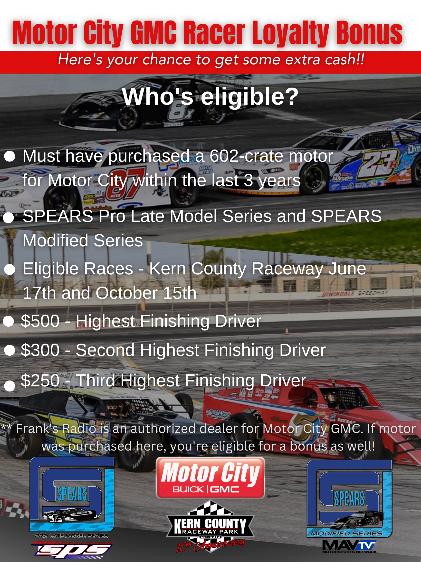 REMINDER: For the upcoming race at Kern County Raceway on Sunday, October 15th, longtime series sponsor Motor City GMC is thanking those that support them. If you have purchased a 602-crate motor from Motor City GMC in the last three years, you are eligible for a cash bonus at the October 15th race. The following bonuses will be awarded to the finishers that have purchased a 602-crate motor from Motor City GMC: