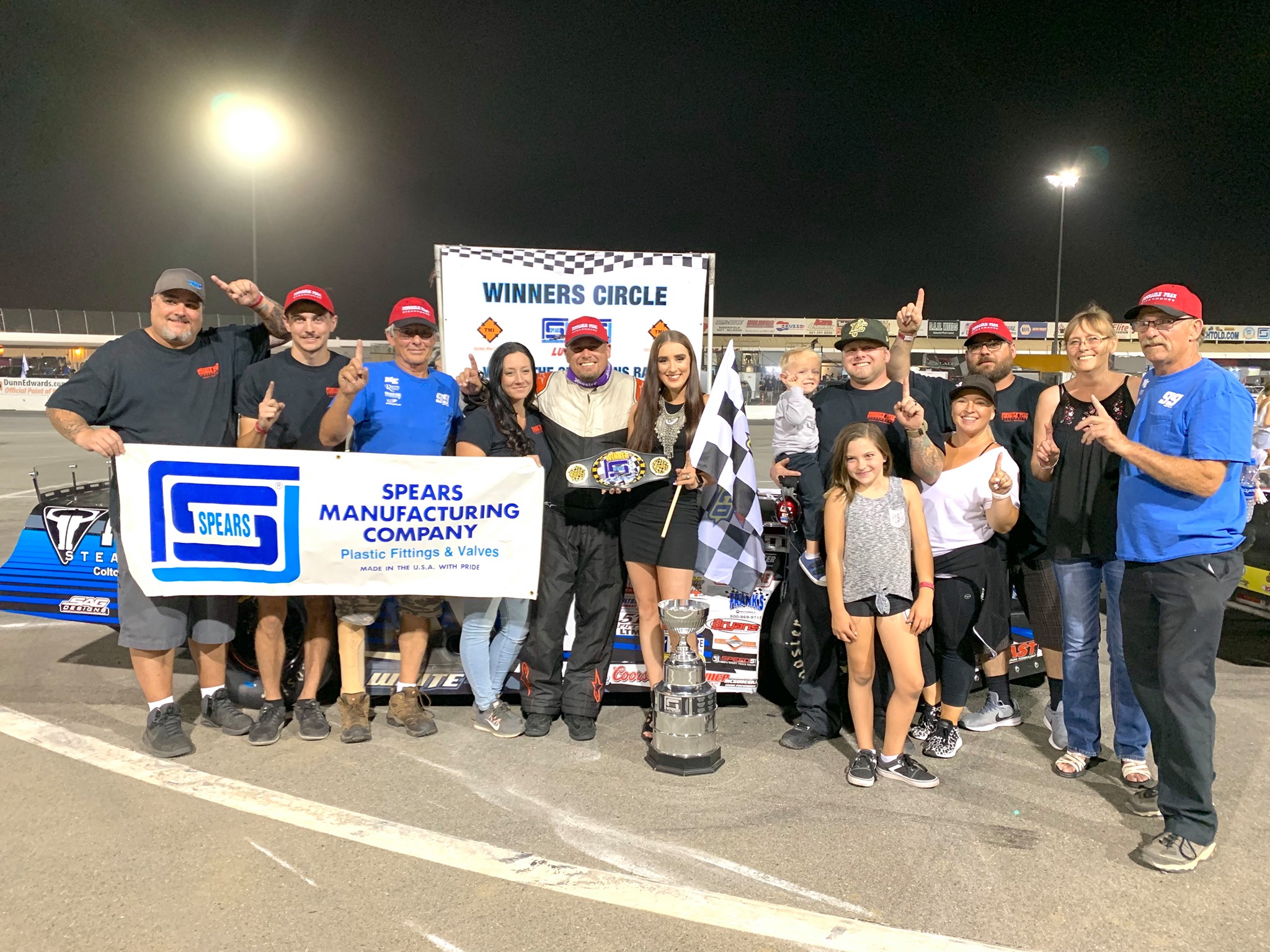 “I have so many people to thank, God for the ability and blessings, White began! “I have gotta thank Earl Robbins for choosing me to drive his car. Pinnacle Peak Steakhouse San Dimas, Swift Springs, HPSI ( Hydraulic Power Systems, Inc. ), SAG Graphics, WTG Chassis, Rowdy Manufacturing and our guys that prep and go to these tracks and bust their tails. I want to thank Earl, Sunny, Dad, Glenn Davis, Chris, Sparky, E.J., Zach, Josh, Susie, Kristyn, Chandace, Chase and Matthew.